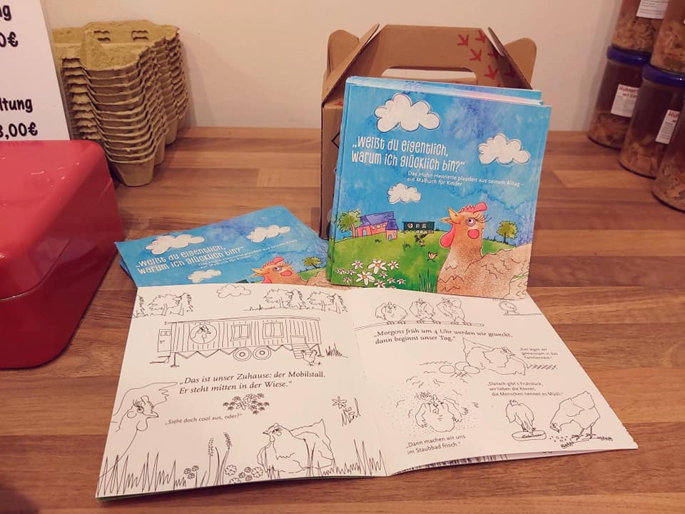 Und für unsere kleinen Kunden zum mitnehmen:ein tolles Malbuch über das Leben einer Henne im Mobilstall.