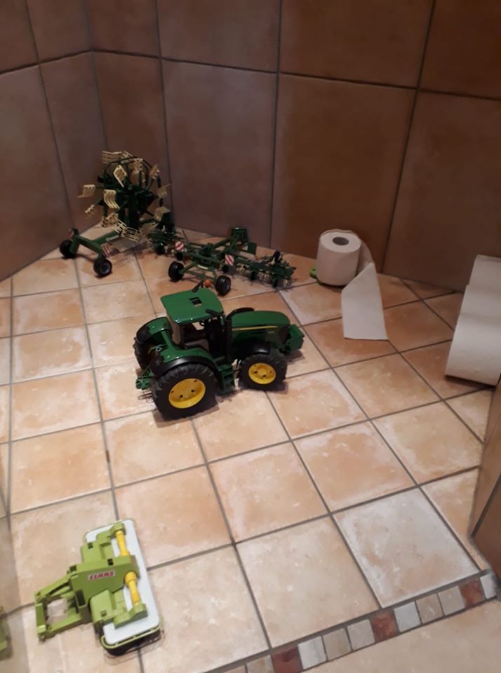 Dieser Moment wenn man nun ja...auf dem stillen Örtchen verweilt...sich routiniert zum Toilettenpapier umdreht und da ist nix🙄Obwohl man sicher ist gestern alles nachgefüllt zu haben🤔Die Lösung findet sich in der Dusche.Heu und Stroh wurden die letzten Tage bei uns gemäht,gewendet,geschwadet,gepresst und eingefahren...muss der Junior natürlich auch...in Ermangelung an Rundballen halt mit Klopapierrollen.....